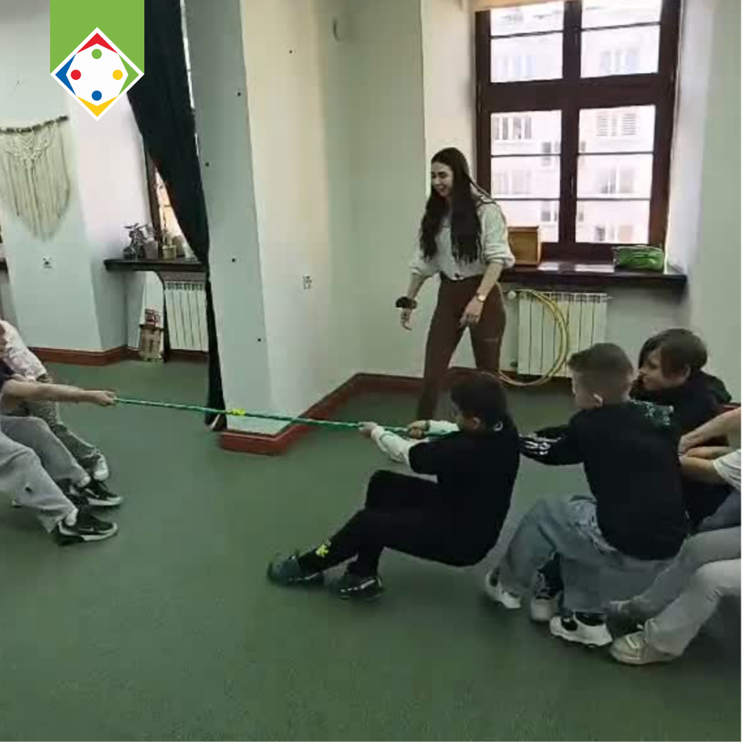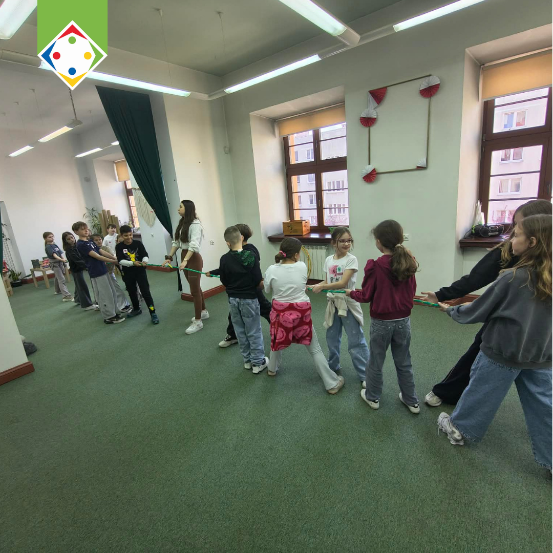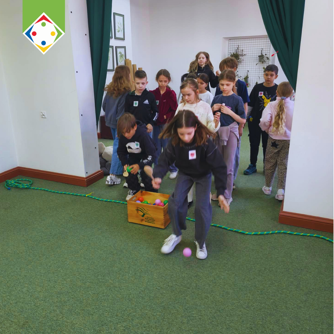 Po literackim wstępie przyszedł czas na aktywność ruchową. Dzieci zostały podzielone na dwie drużyny – Gryffindor oraz Slytherin – i z dużym zaangażowaniem uczestniczyły w przygotowanych konkurencjach. Wśród zadań znalazły się rzuty woreczkami do celu oraz przeciąganie liny.