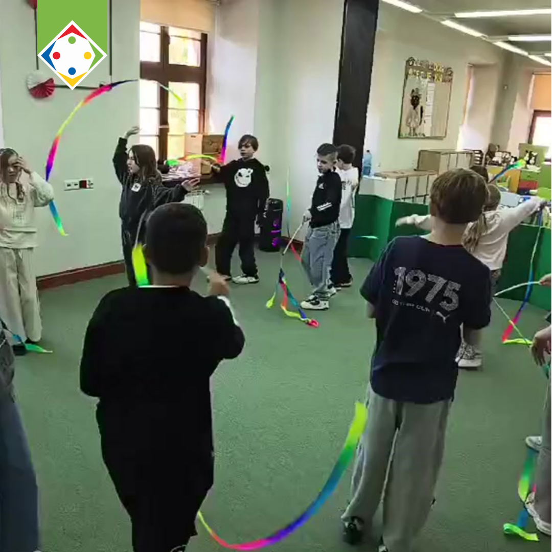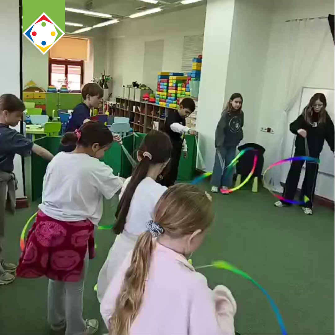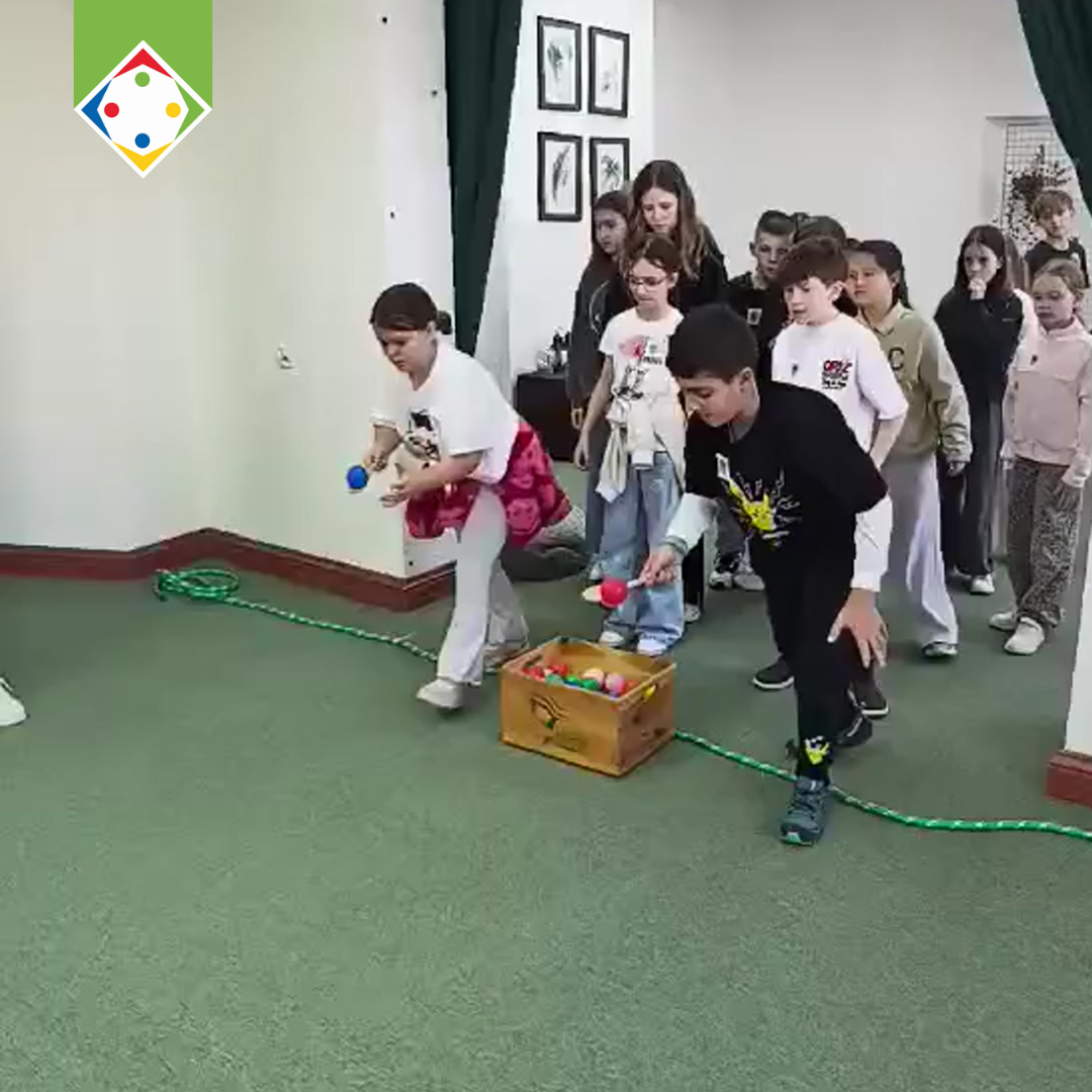Po literackim wstępie przyszedł czas na aktywność ruchową. Dzieci zostały podzielone na dwie drużyny – Gryffindor oraz Slytherin – i z dużym zaangażowaniem uczestniczyły w przygotowanych konkurencjach. Wśród zadań znalazły się rzuty woreczkami do celu oraz przeciąganie liny.