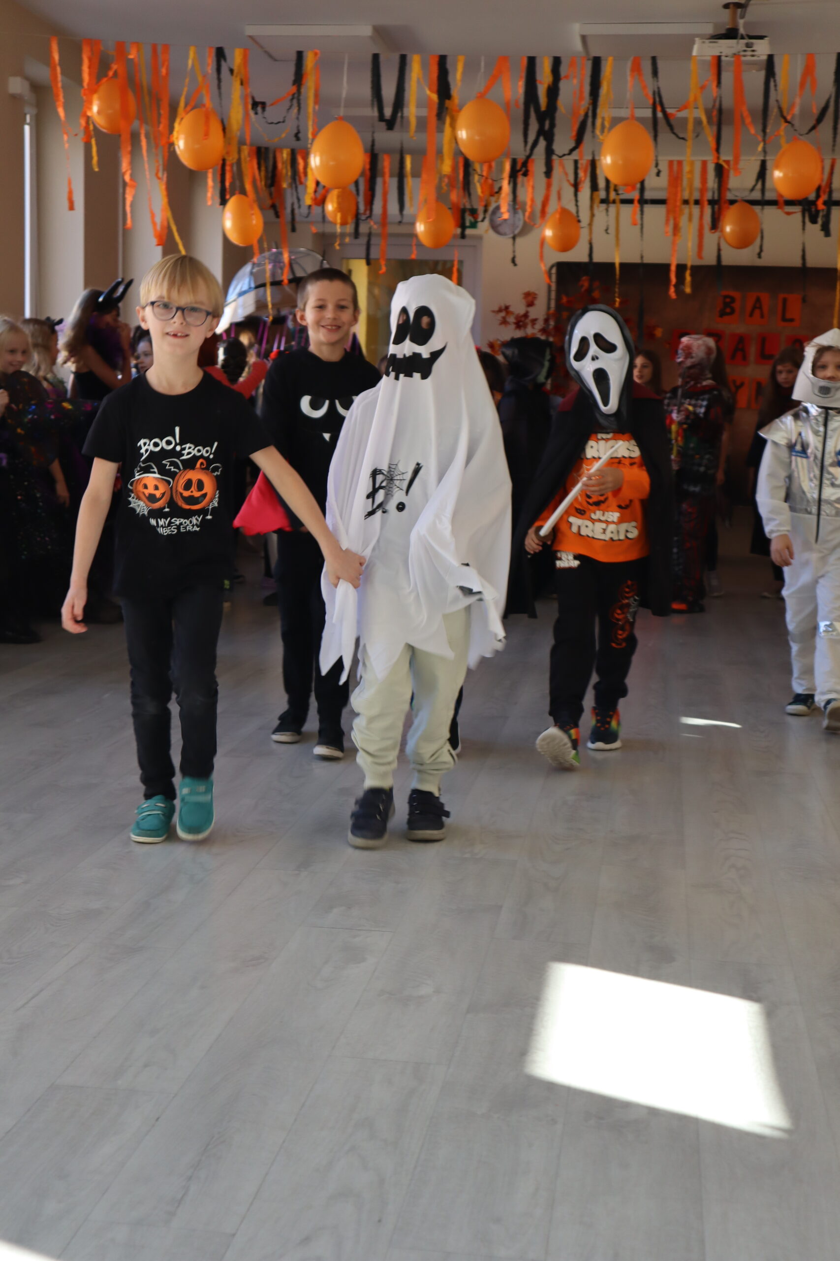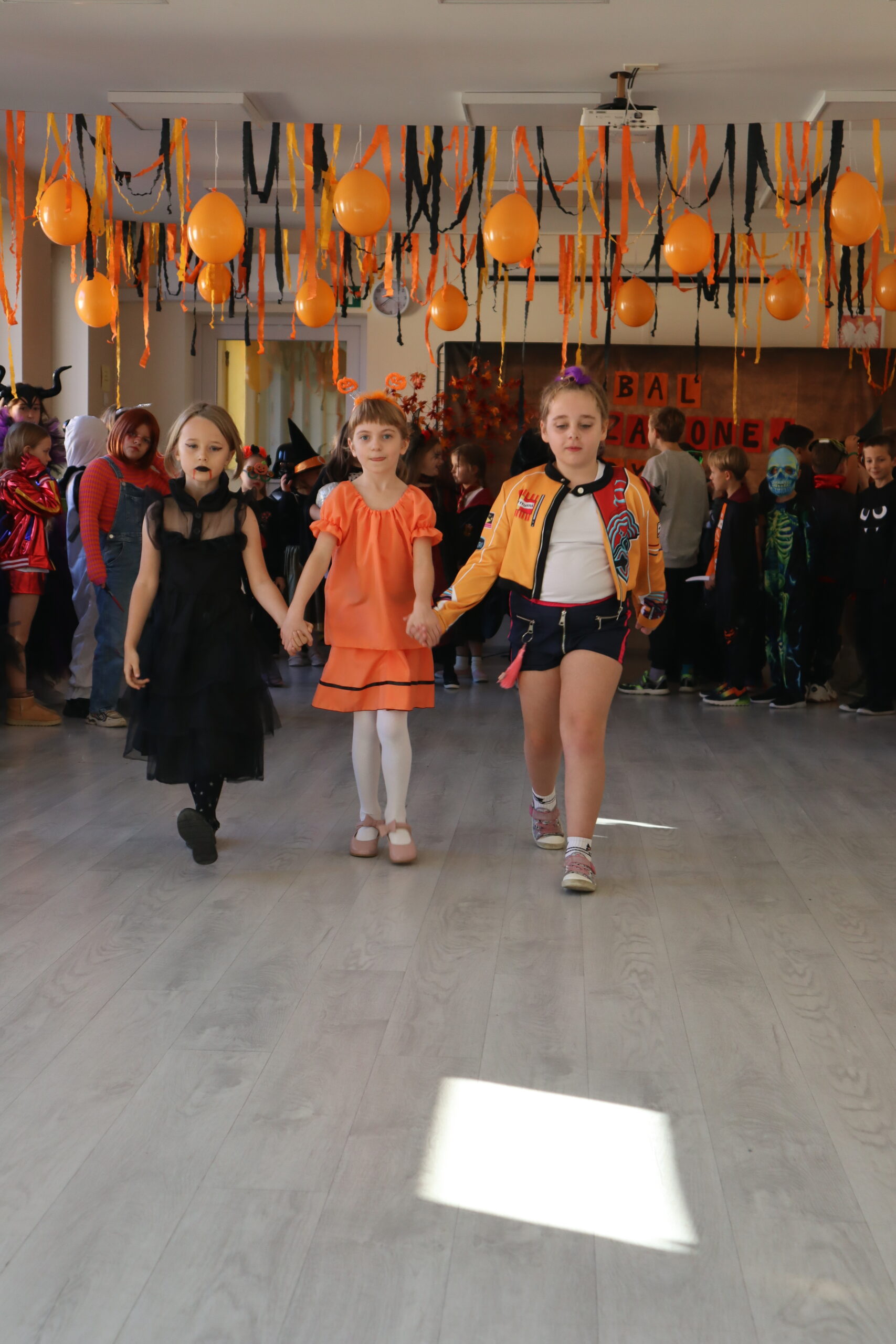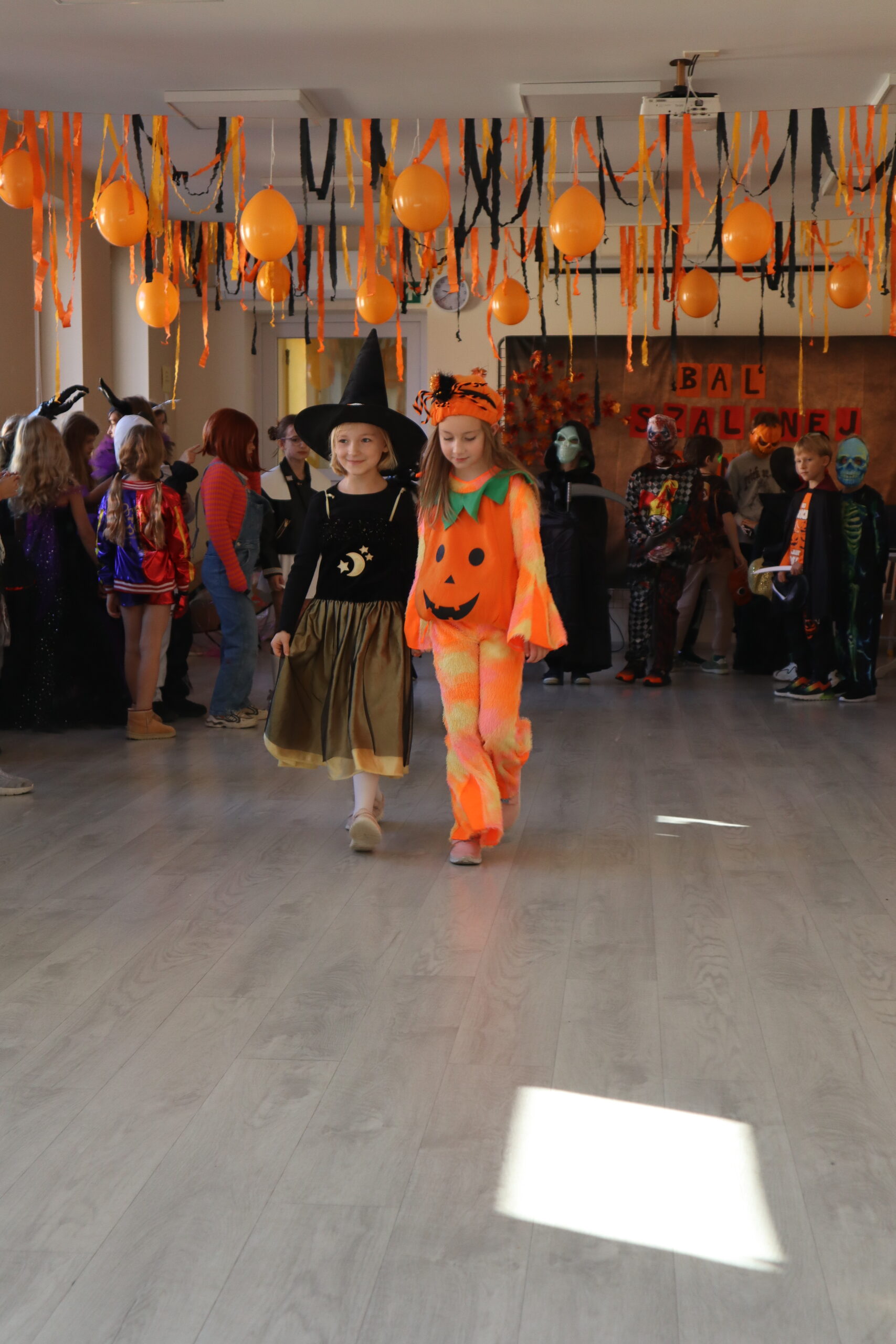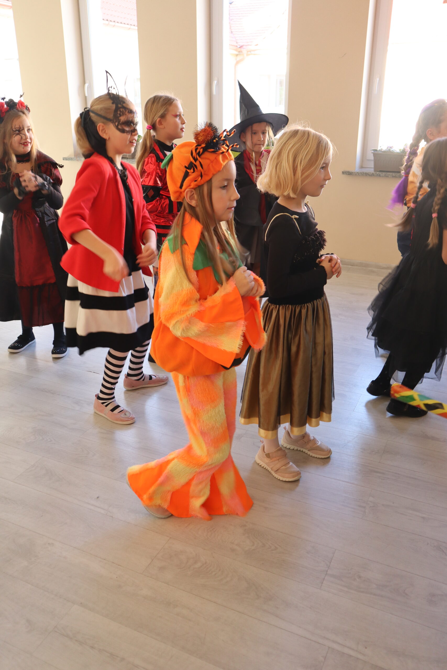 Na szkolnej auli królowały kreatywne stroje – dynie, czarodziejki, potworki i wiele innych fantastycznych postaci. Nie zabrakło tańców i gier, a dziewczynki z klasy 3 wcieliły się w prowadzące zabawę, pokazując układy taneczne, które następnie wykonywały wszystkie dzieci!