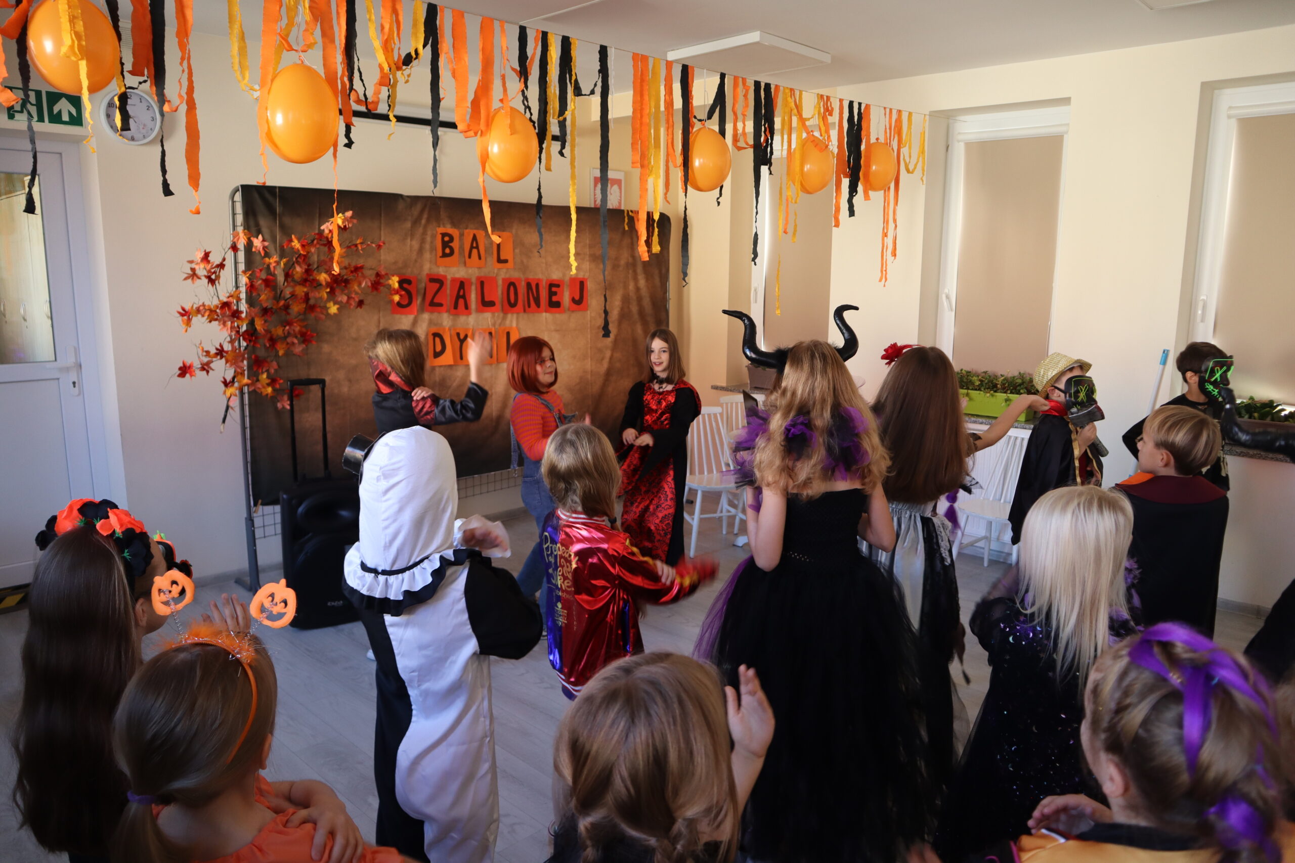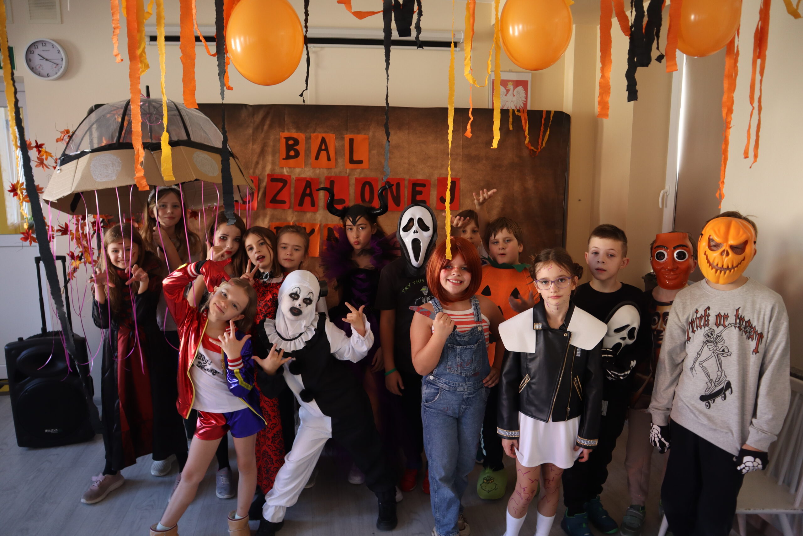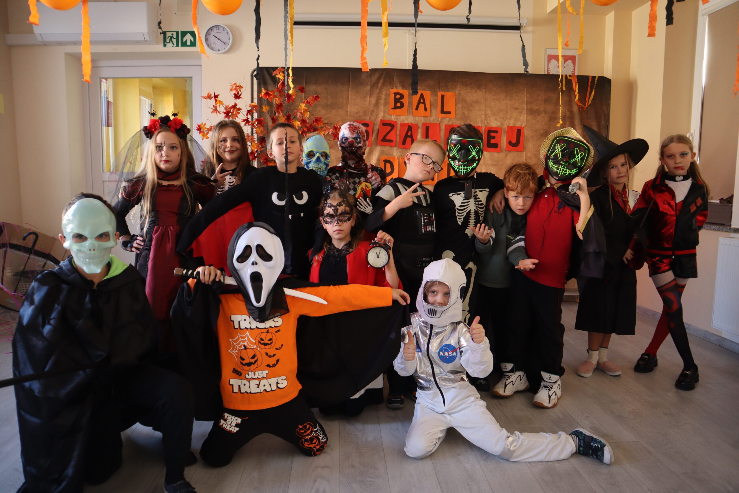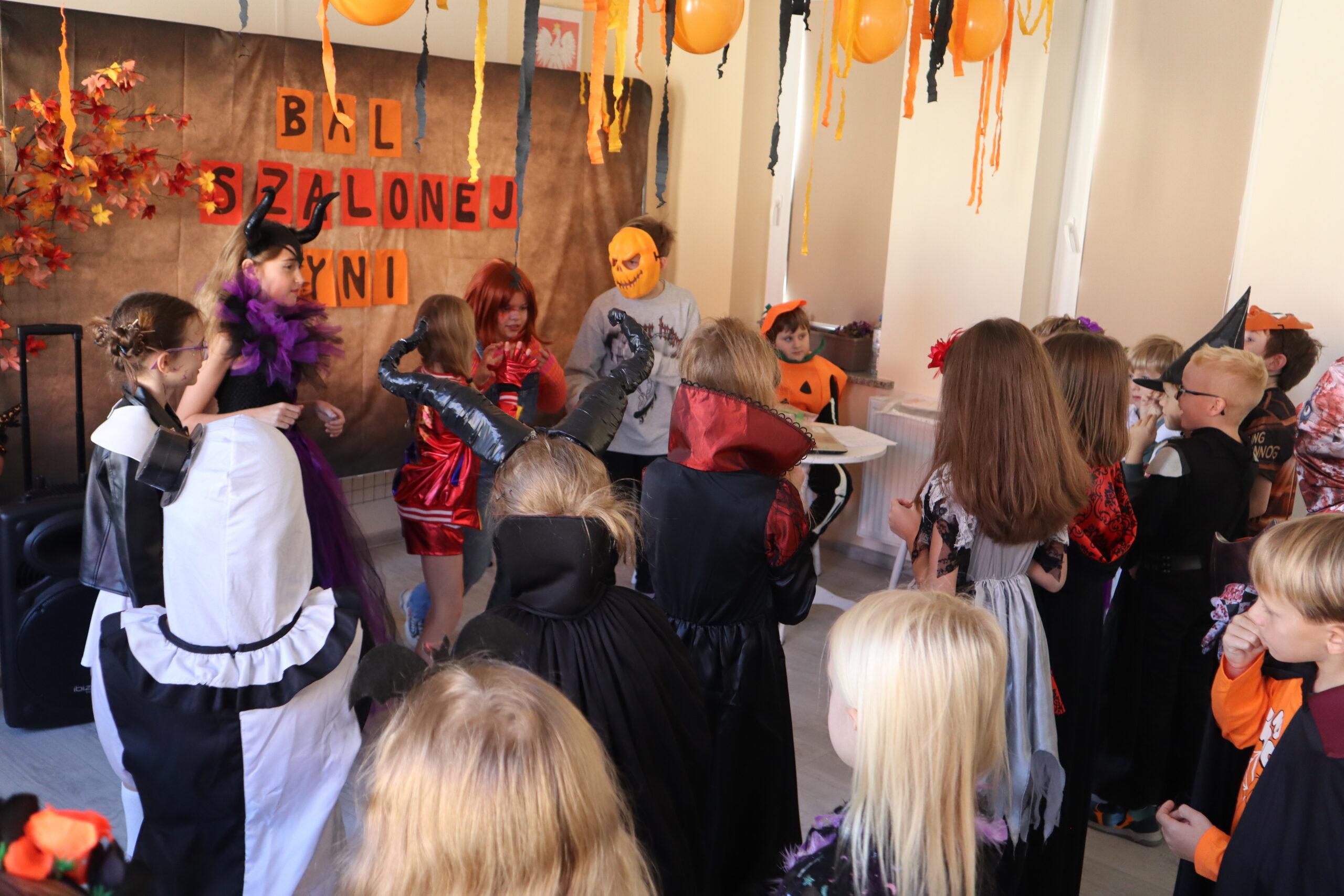Na szkolnej auli królowały kreatywne stroje – dynie, czarodziejki, potworki i wiele innych fantastycznych postaci. Nie zabrakło tańców i gier, a dziewczynki z klasy 3 wcieliły się w prowadzące zabawę, pokazując układy taneczne, które następnie wykonywały wszystkie dzieci!