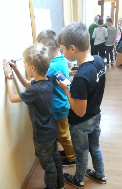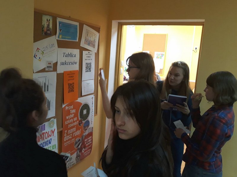 Uczniowie wyposażeni w smartphony szukali w budynku szkoły zadań zaszyfrowanych pod postacią kodów QR. Na wykonanie zadania ( rozszyfrowanie pytań i udzielenie odpowiedzi) były przewidziane przerwy do 7 lekcji.
