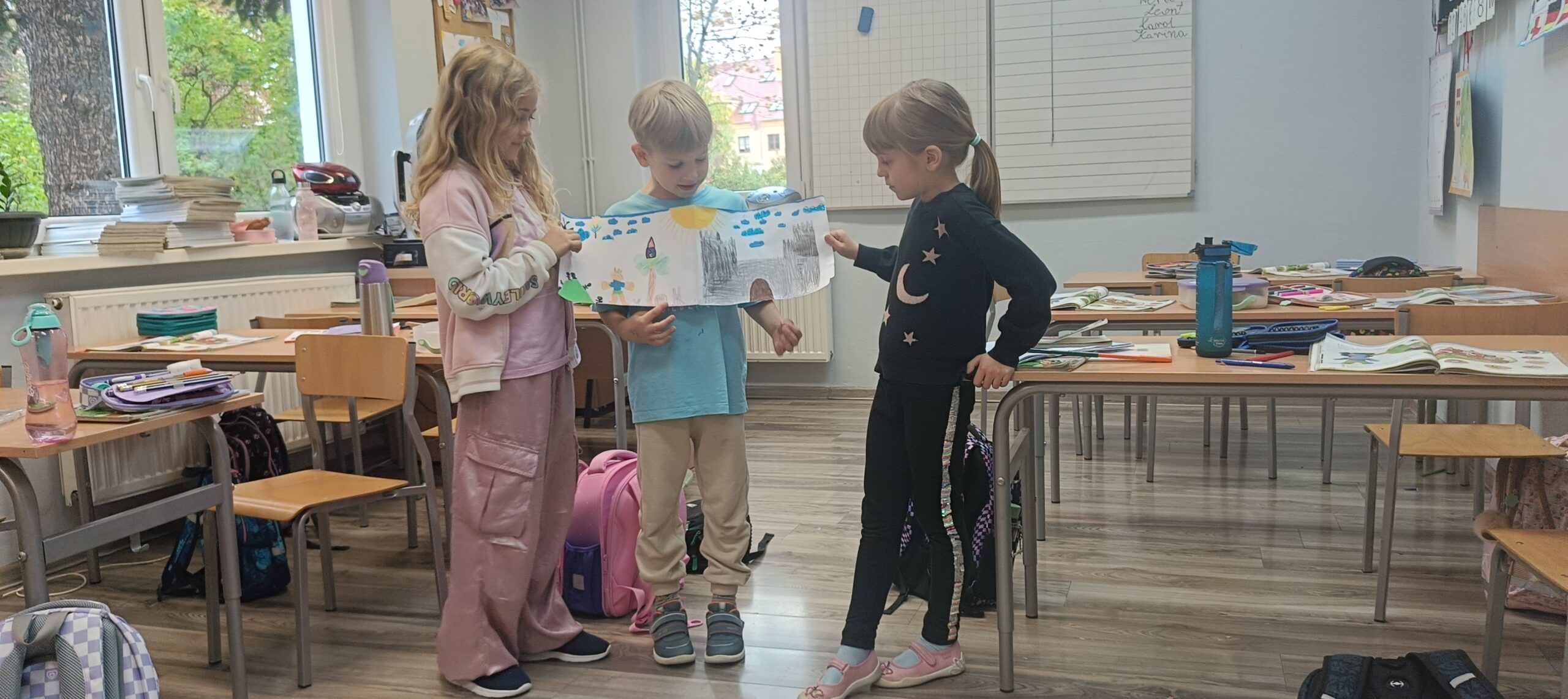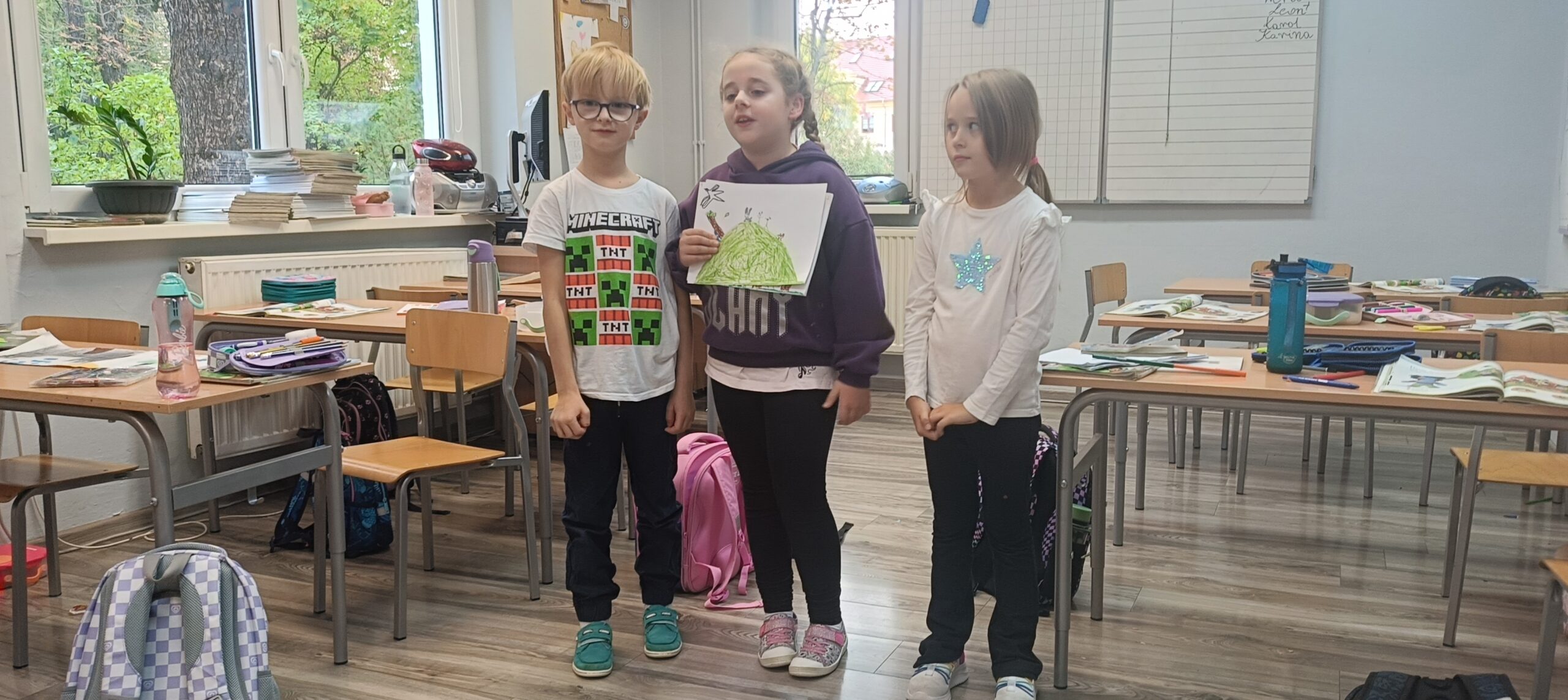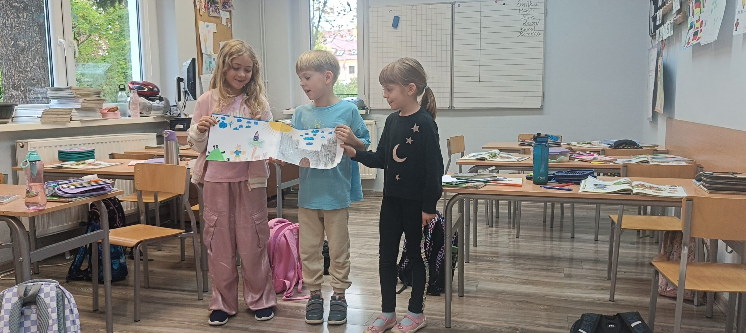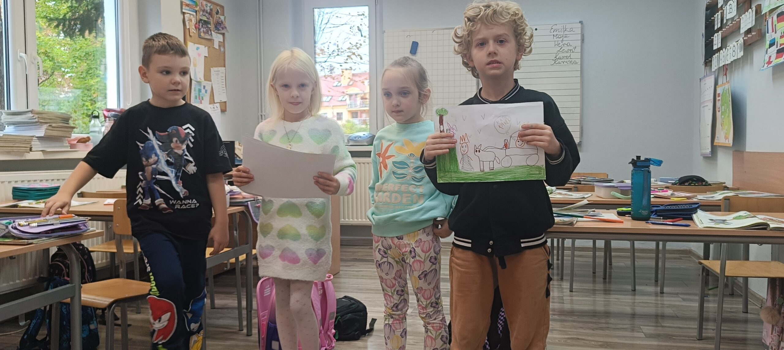 Dzieci nie tylko tworzyły fabuły i dialogi, ale również przygotowały piękne ilustracje, które ubarwiły ich historie. Następnie z dumą zaprezentowały swoje prace kolegom i koleżankom z klasy.