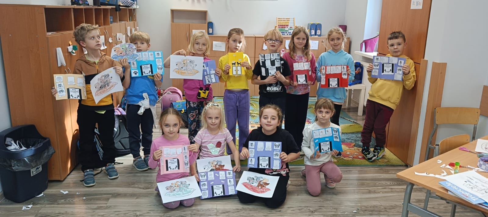 Po wspólnym czytaniu i rozmowach o przygodach psich bohaterów, dzieci przygotowały przepiękne lapbooki, w których przedstawiły najważniejsze informacje o pieskach, ich zwyczajach i przygodach.